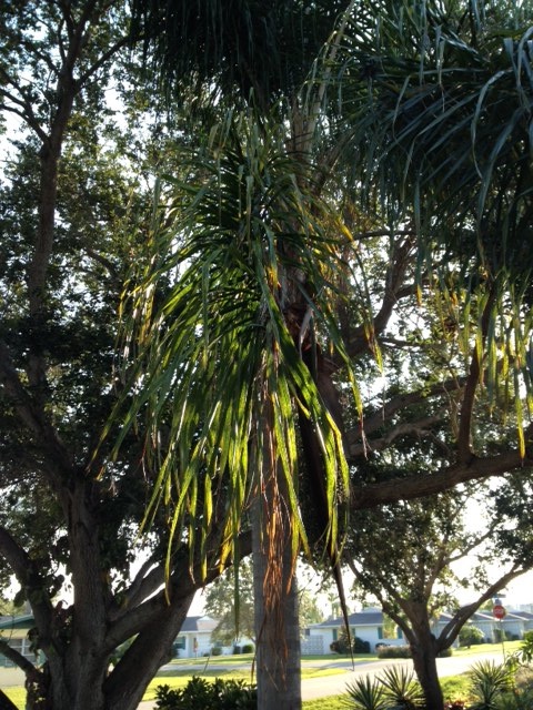 Their magic is accommodation. They share leaves that bend, split, unfold, and shred as they dance the wind spirit. Leaves on branches that ride the top o’ the gale, always illustrating wind, never “bracing against.” No matter how fierce the blow, they flow in non-resistance. Palms win their survival by yielding; being one with what is present. No good to burn, and hard to get close to, these are tree survivors.