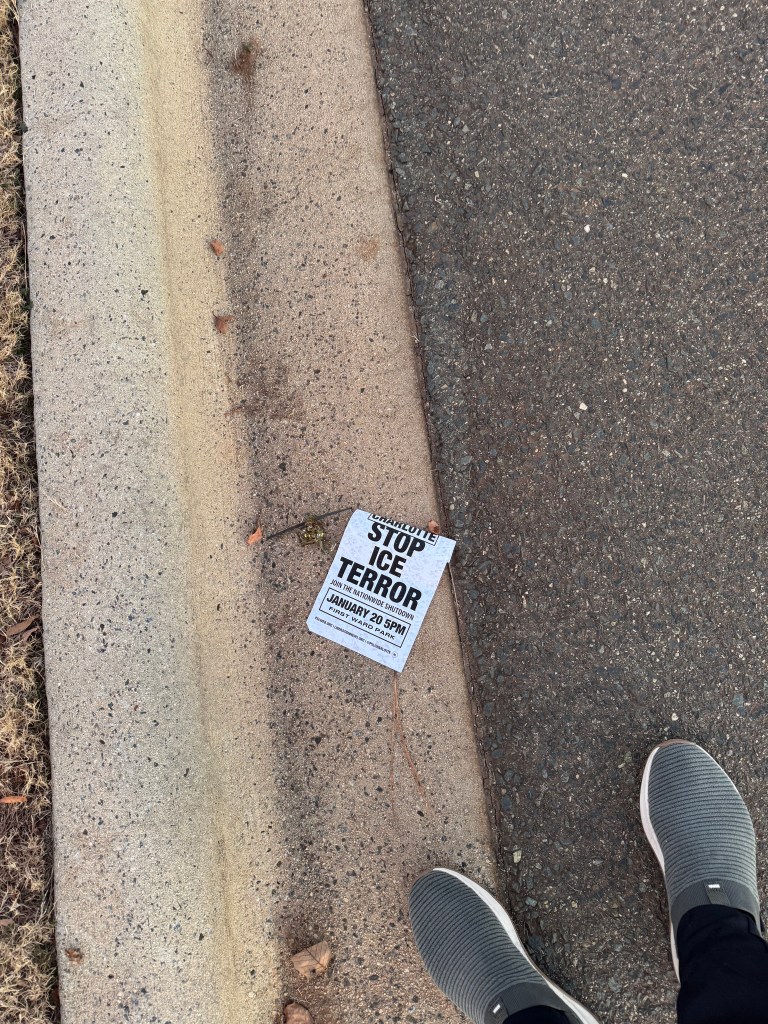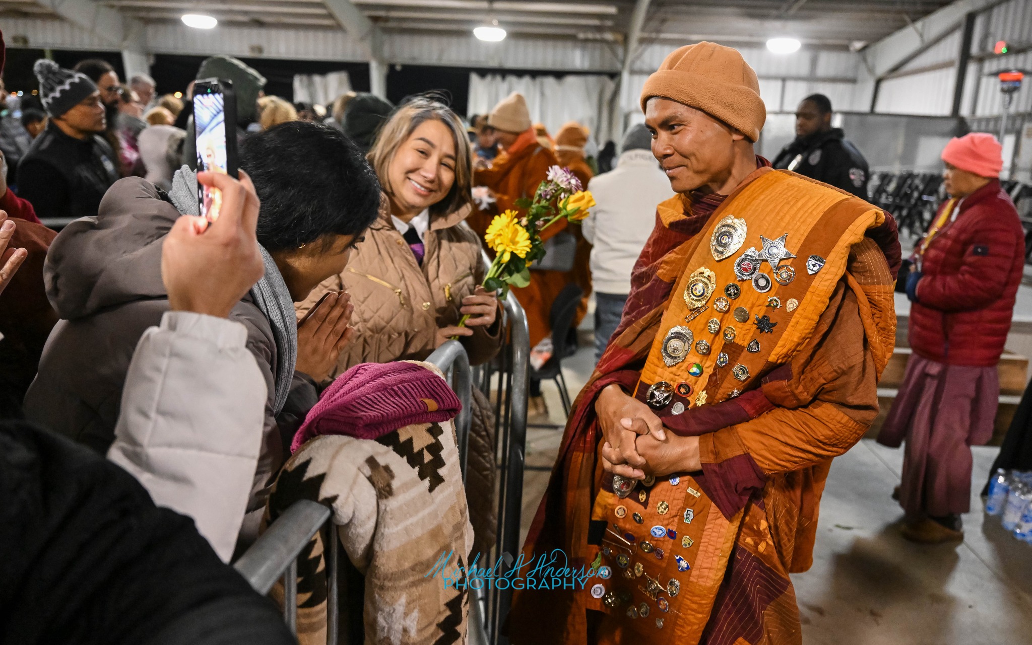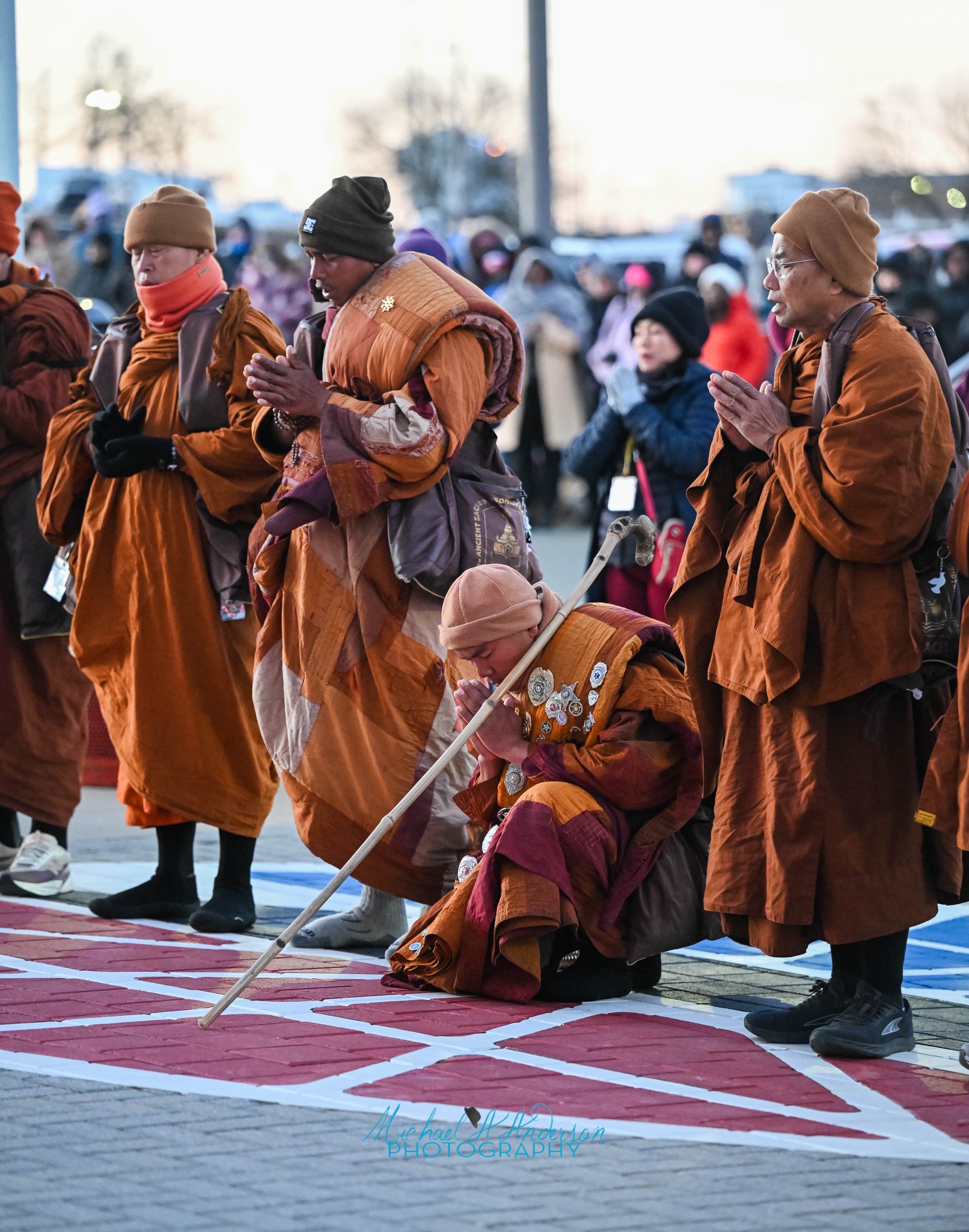 I had my first encounter with Walk for Peace energies as the sun set in Concord, North Carolina, just north of Charlotte in the vast parking lot of a drag car race track. The dichotomy of how they walk, and where they land each day, is part of the mystery for me. The monks eat their daily meal at noon and speak to the gathered at lunch, and again at the end of the day’s journey, stopping at places offered by the community. Some are municipal parks, they sleep in tents on the ground, sometimes churches, or community centers.  On this cold night they would rest inside. There had been many thousands that walked behind them in the city of Charlotte the day before. I think the host officials were preparing for an unknown number of followers, this fit the need. The care of the Police in each county is touching, respectful and cautious of their safety. Think of that dichotomy, they are in the proximity and protection of pure loving energy.