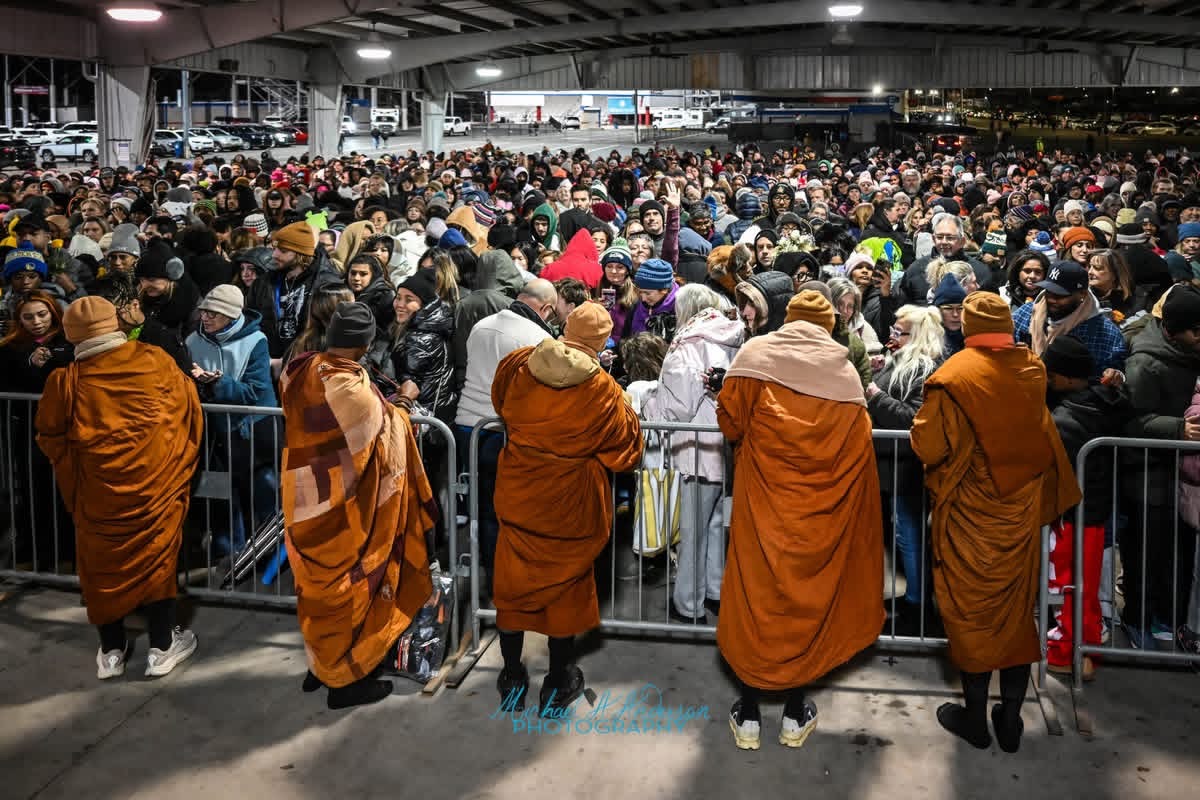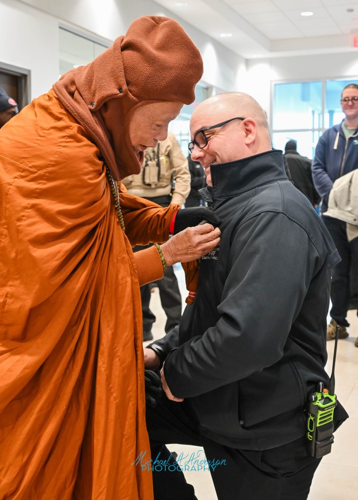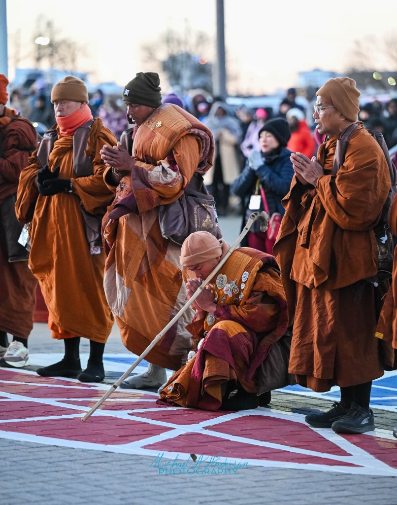 Standing on a low stage the leader, Venerable Bhikkhu Paññākāra, guided us in a Forgiveness meditation, a process practiced in most stops. Think of how many people have chosen to do this, even once. Together, a thousand beings with hands on our hearts, are offered an opportunity to focus on forgiveness others and ourselves for every mistake and hurt given and received in our lifetime, and those of our ancestors.  Supported, held, and elevated by the loving intent from the Monks praying quietly on the stage, we sought our personal Inner Peace.             There is no judgement or reasoning about who is wrong, or how I could be a better person, it is only about being in what is here today.Being, not a new concept. This being starts with each breath anew. It begins with, “Imagine the faces of your Mother and Father, see them there on your heart.” I felt a flood of released energies, like a flock of birds flying together. It was an energy of relief, joy, freedom. I was grateful for the people around me, rooted deeply on cold concrete, all of us being collective emissaries of a reimagined life.